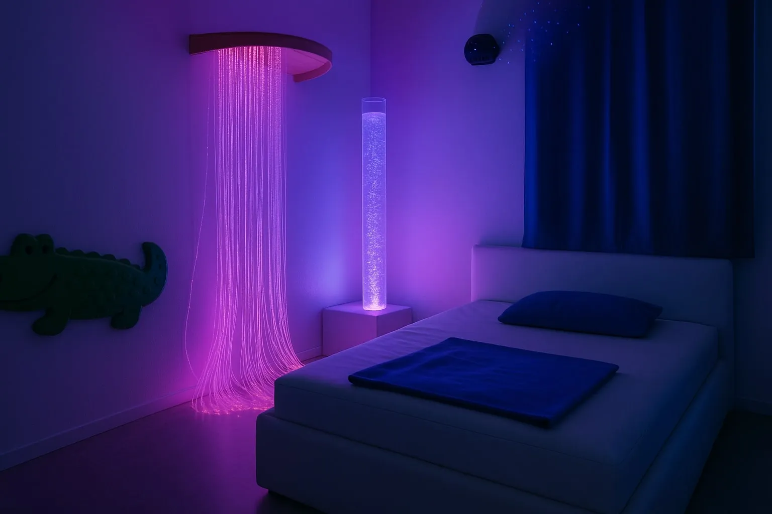 Une salle Snoezelen se présente comme un cocon thérapeutique où chaque élément est soigneusement orchestré. L’éclairage coloré et modulable, les sons apaisants, les textures variées et les parfums doux créent une atmosphère immersive qui stimule les sens en douceur. L’aménagement comprend généralement des matelas d’eau, des fibres optiques, des projecteurs d’images et des objets sensoriels adaptés.